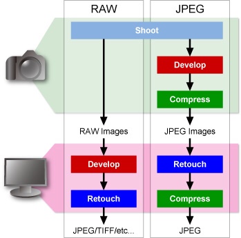 The image below shows the different processes for JPEG and RAW files from camera to ready to view.