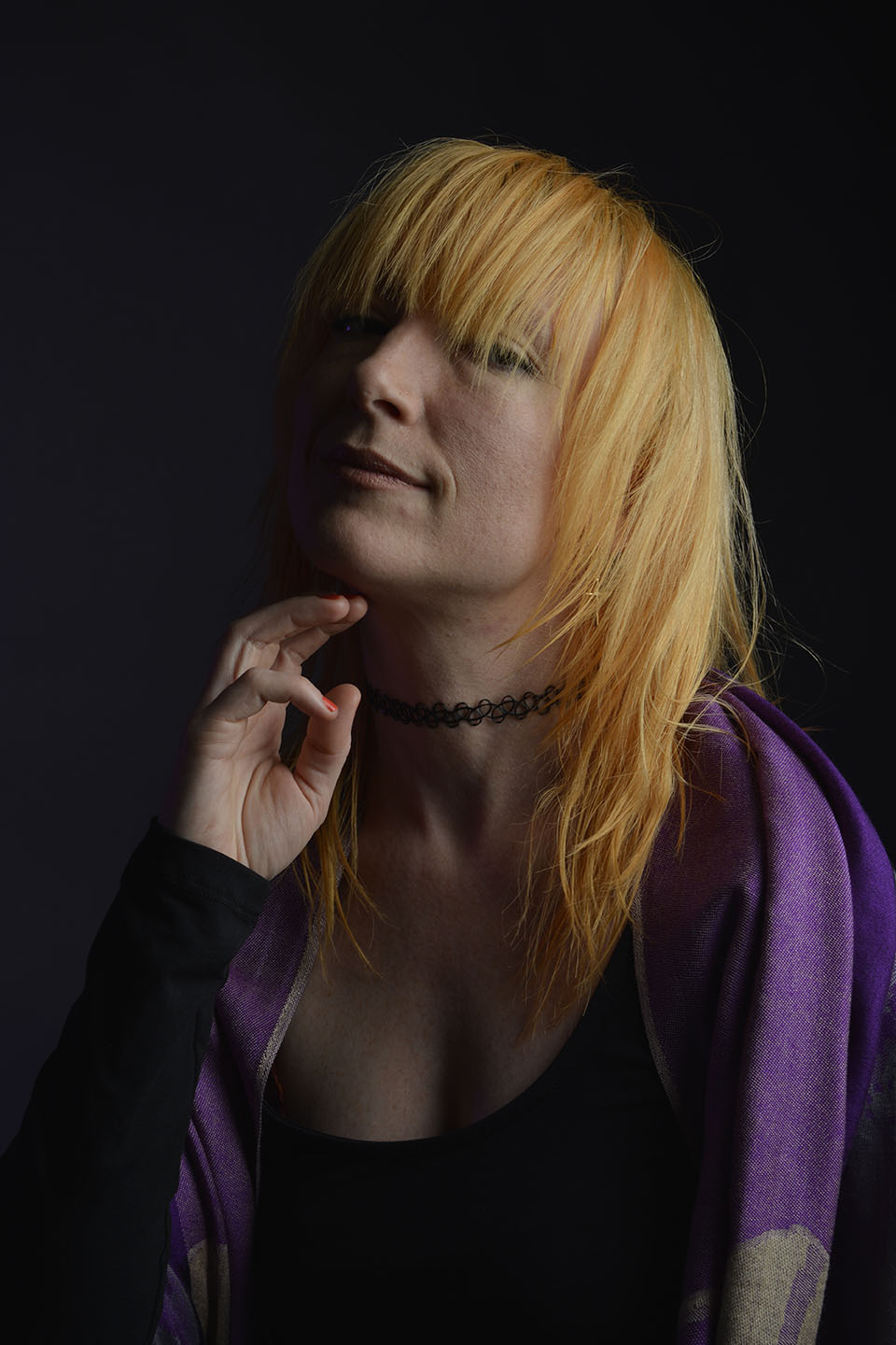 Colour gels/filters were used in these next set of photographs. To complement the models purple shawl and slightly orange hair, purple and orange cellophane have been taped across separate lights. The set up photograph above shows the colours on the lights.