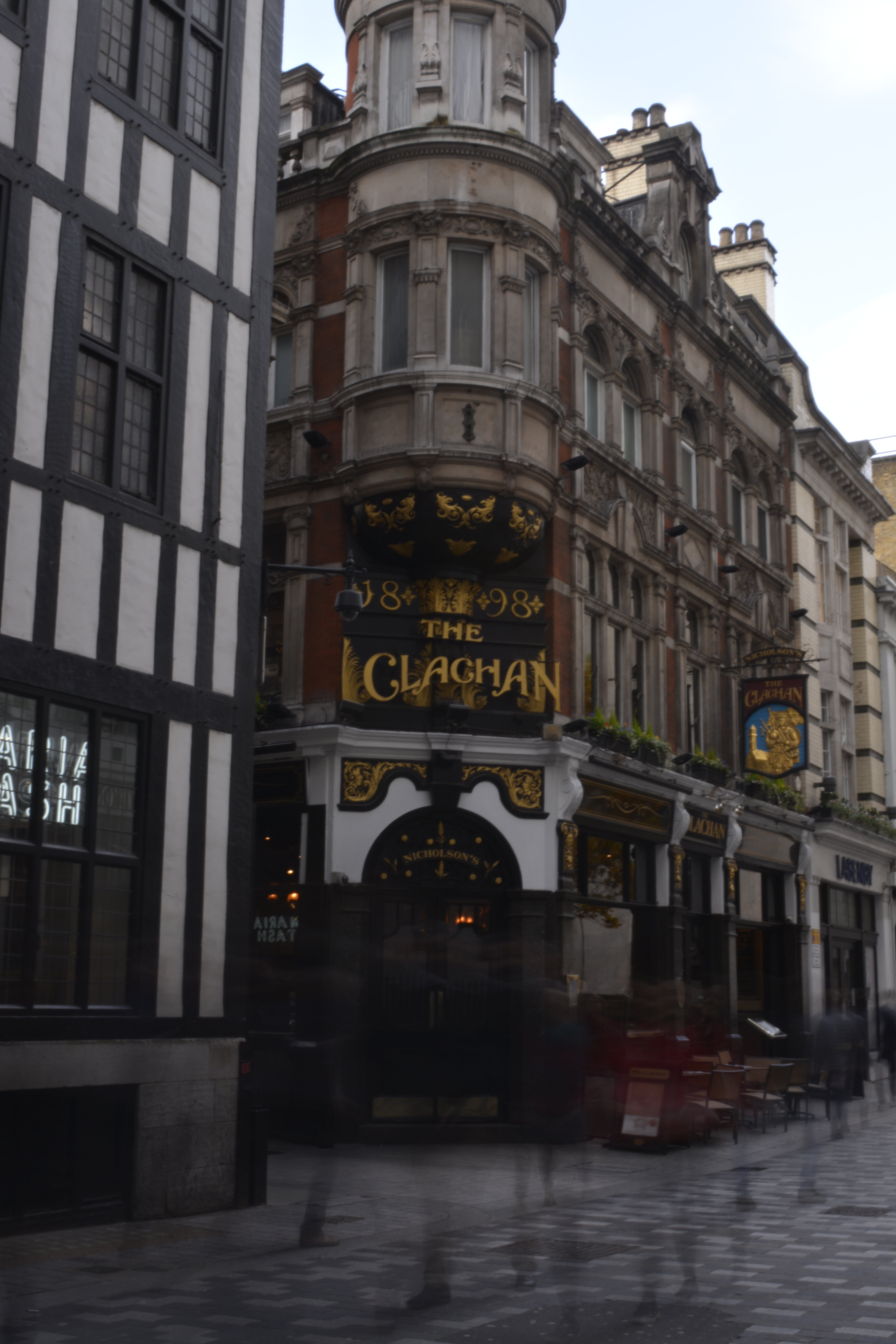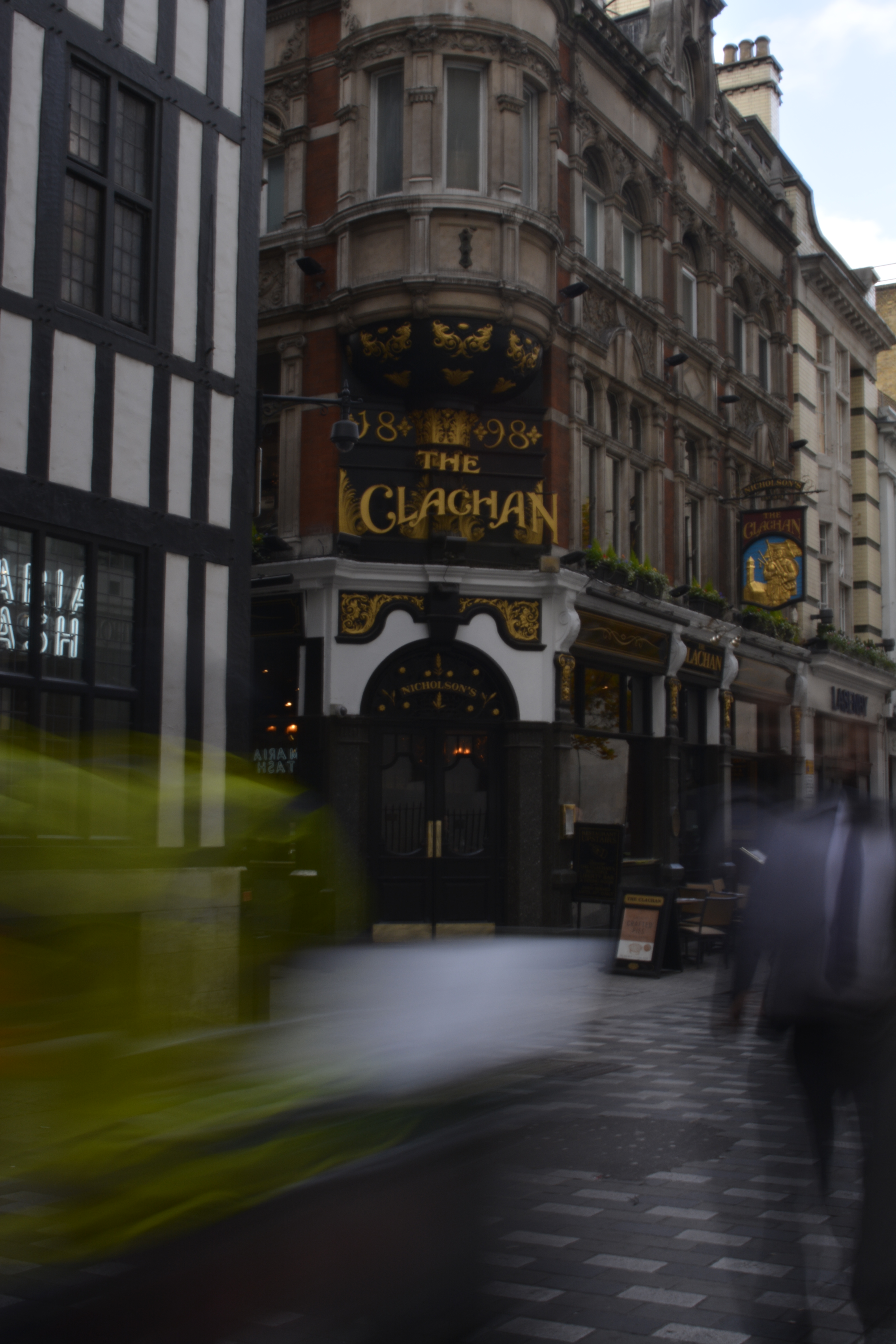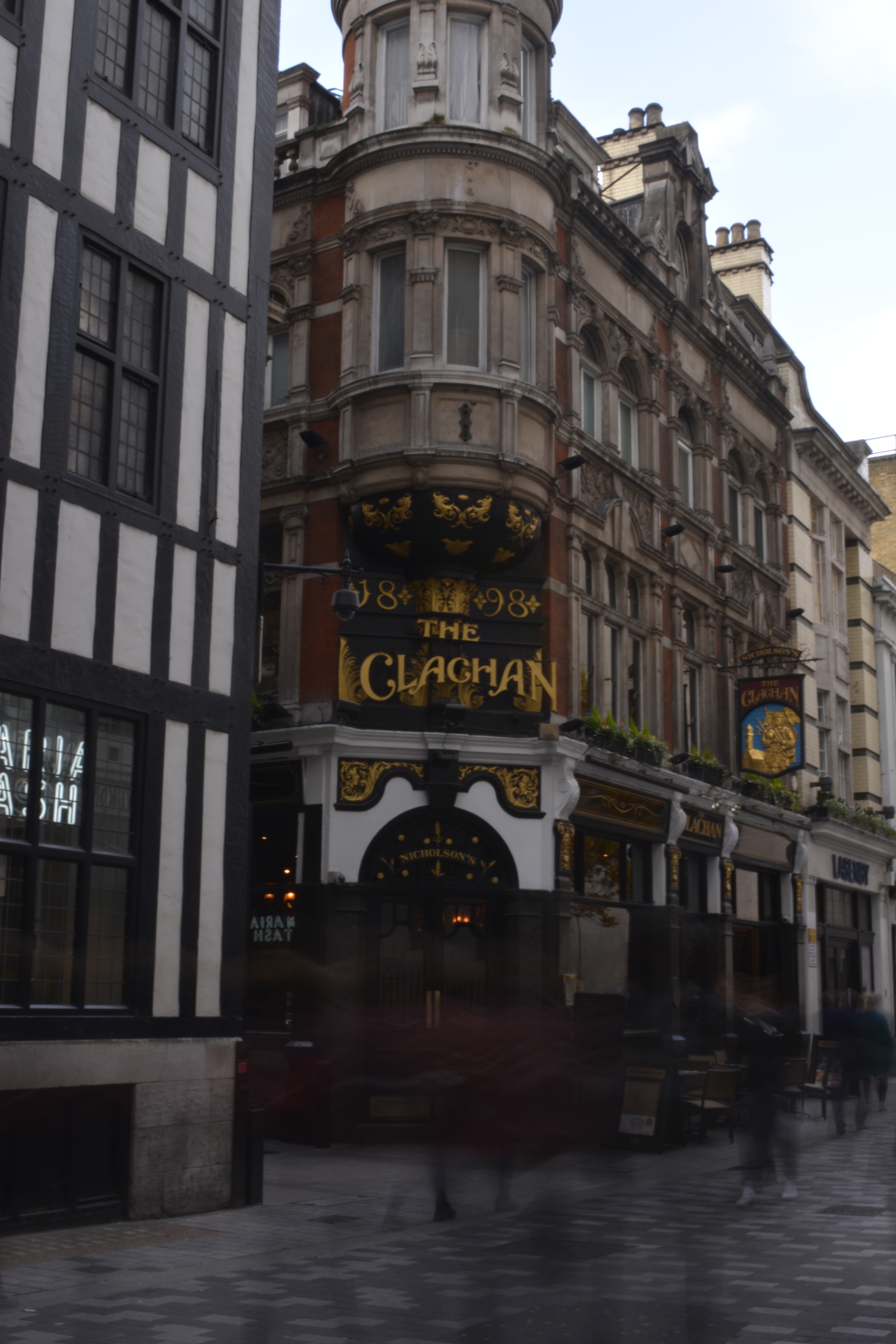 Within post production I had to work a lot with the exposures on this photograph. The original image was a lot darker. Lightening the exposure allowed the centre of the photograph to be nicely exposed, brightening the darker areas of the pub entrance and building facade. I also lightened the shadows that formed the people using the brush tool with curves on Photoshop. This draws the eye to the centre of the photograph where you can see the great detail of the pub and the motion blur from the people.