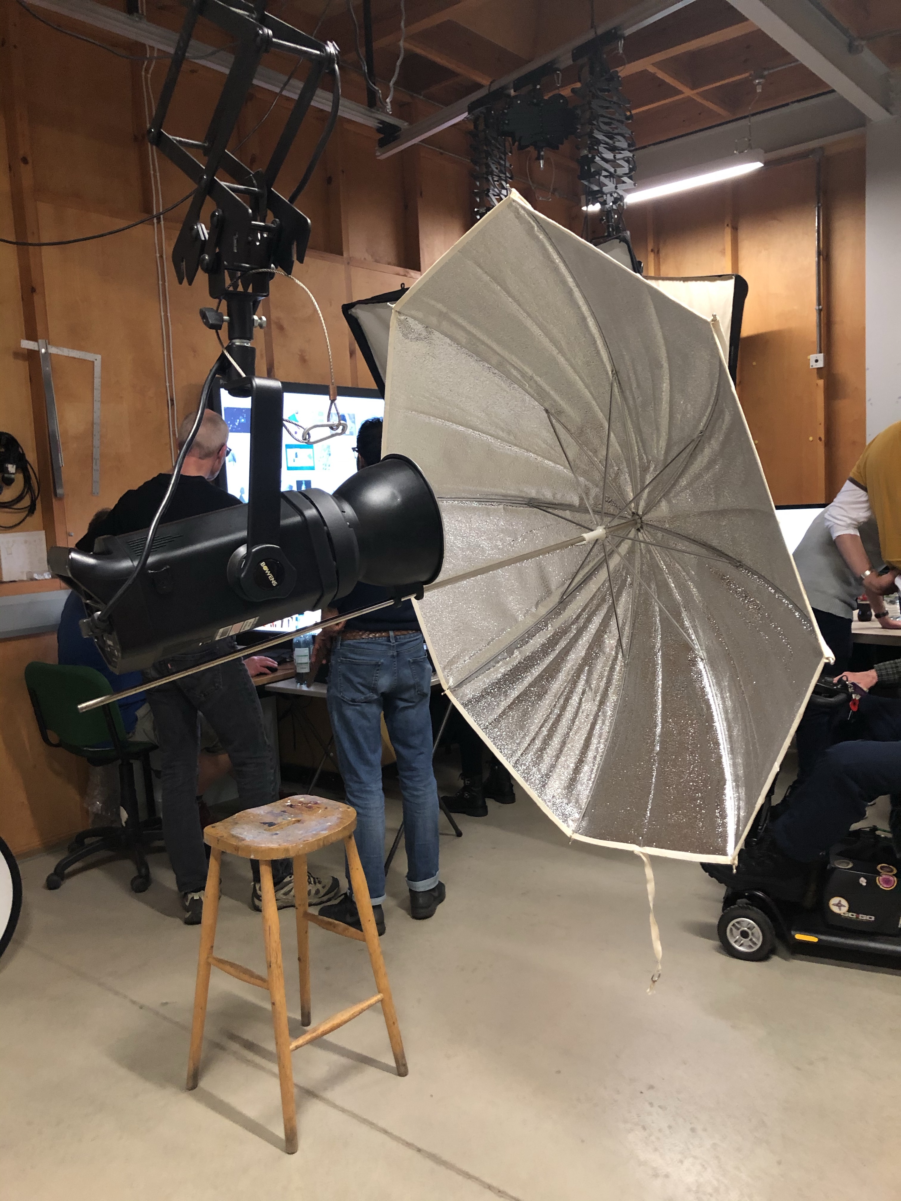 To create a softer light, umbrellas attached to the modelling lamps with adapters have been used to bounce the light back onto the backdrop. Bouncing the light back softens it as it travels.