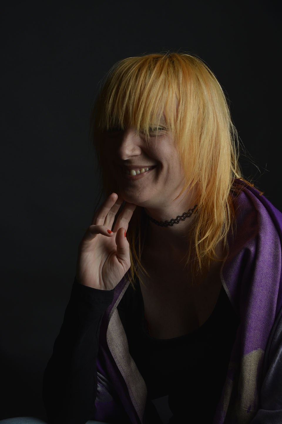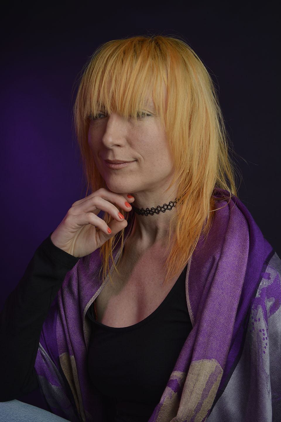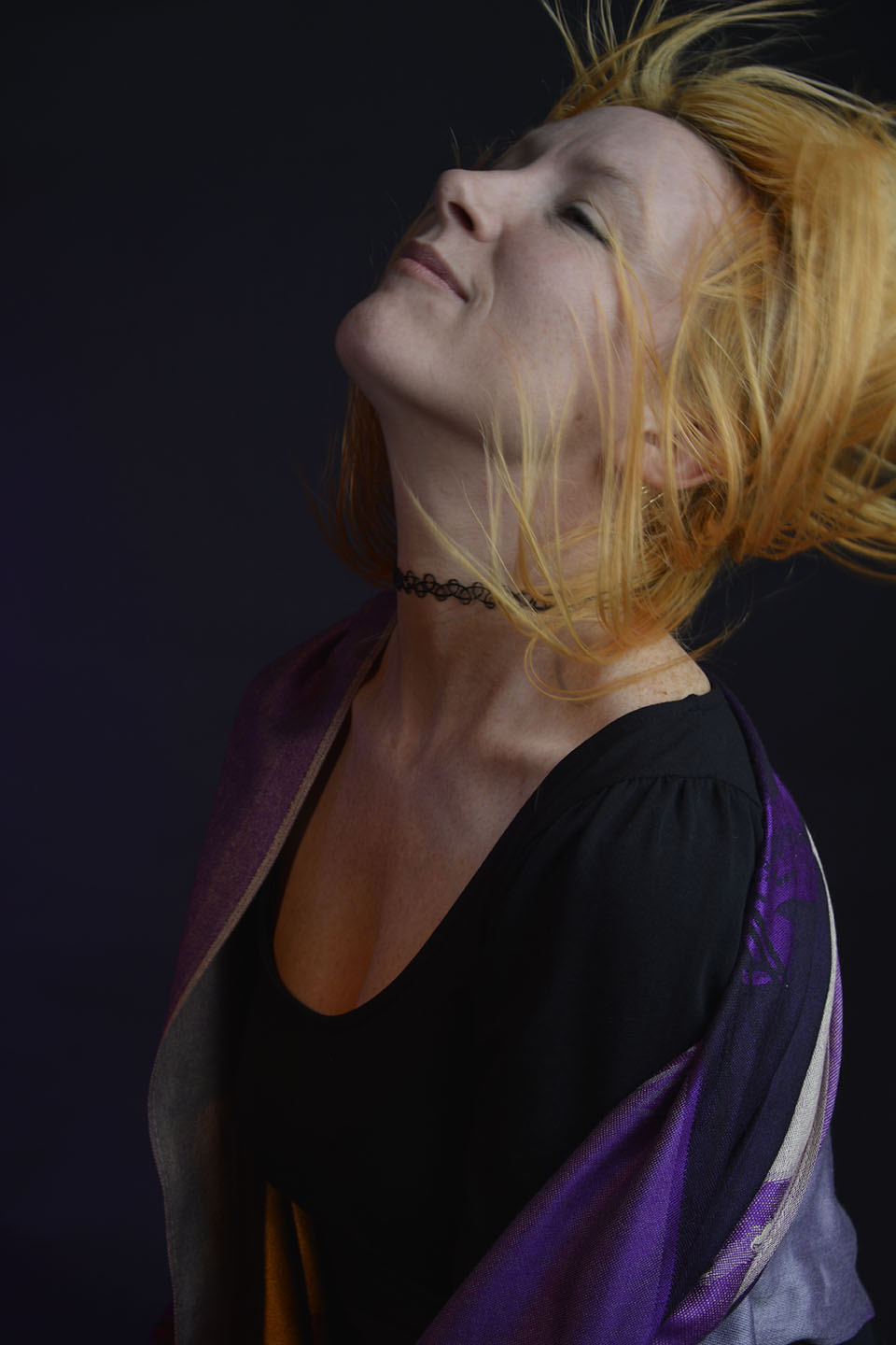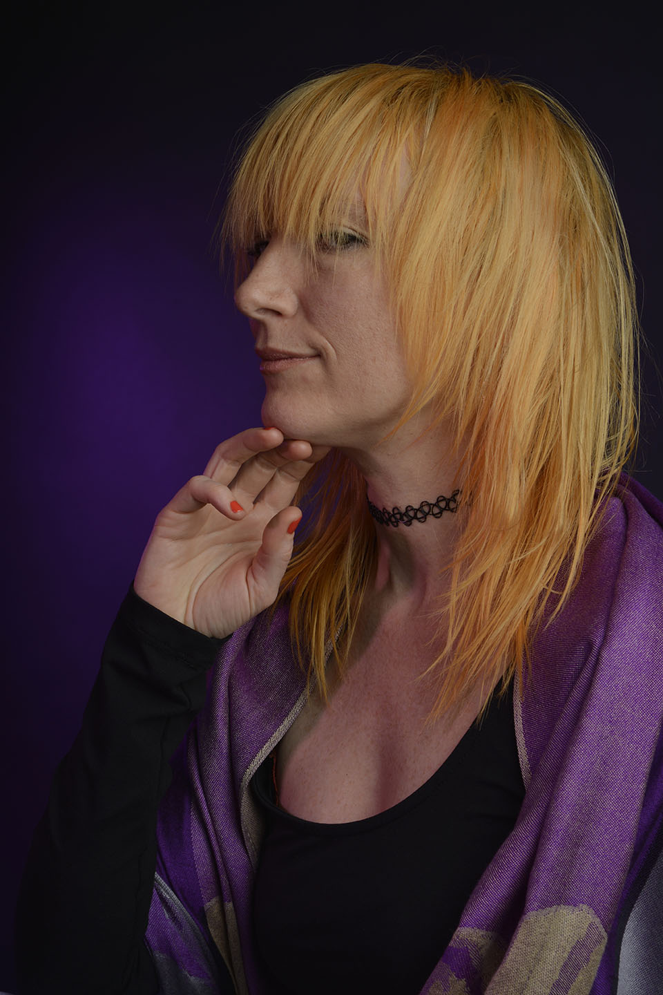Colour gels/filters were used in these next set of photographs. To complement the models purple shawl and slightly orange hair, purple and orange cellophane have been taped across separate lights. The set up photograph above shows the colours on the lights.