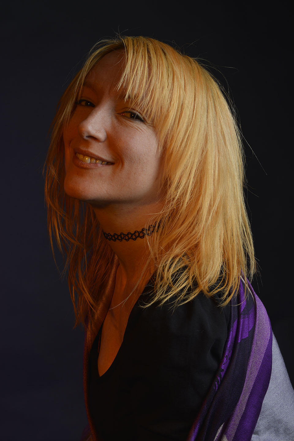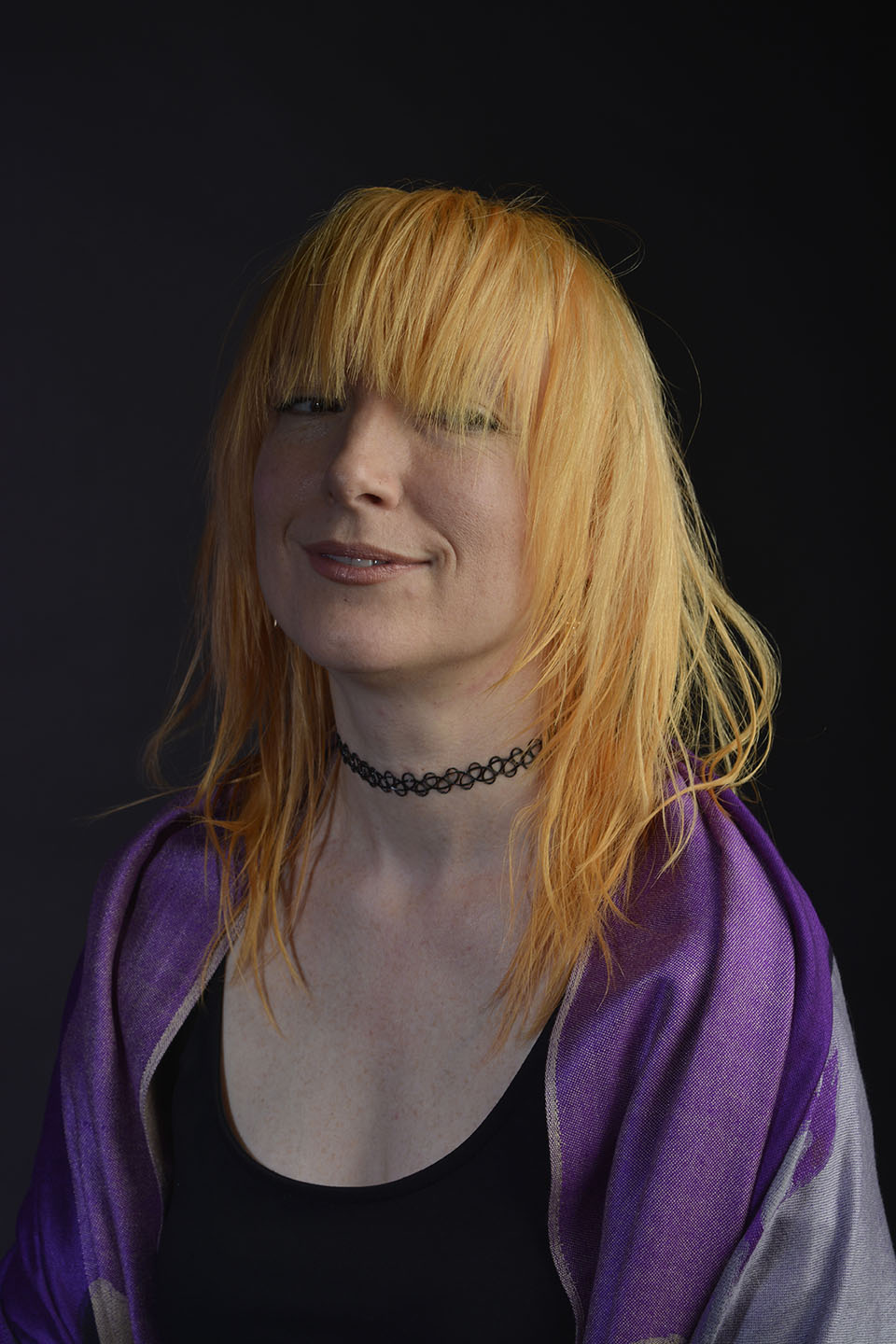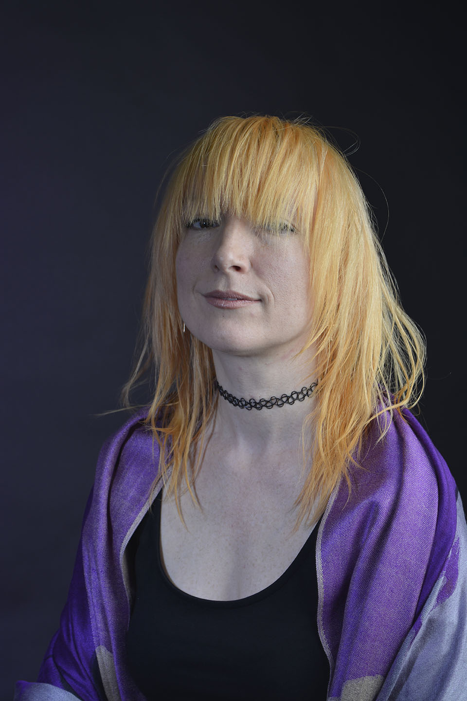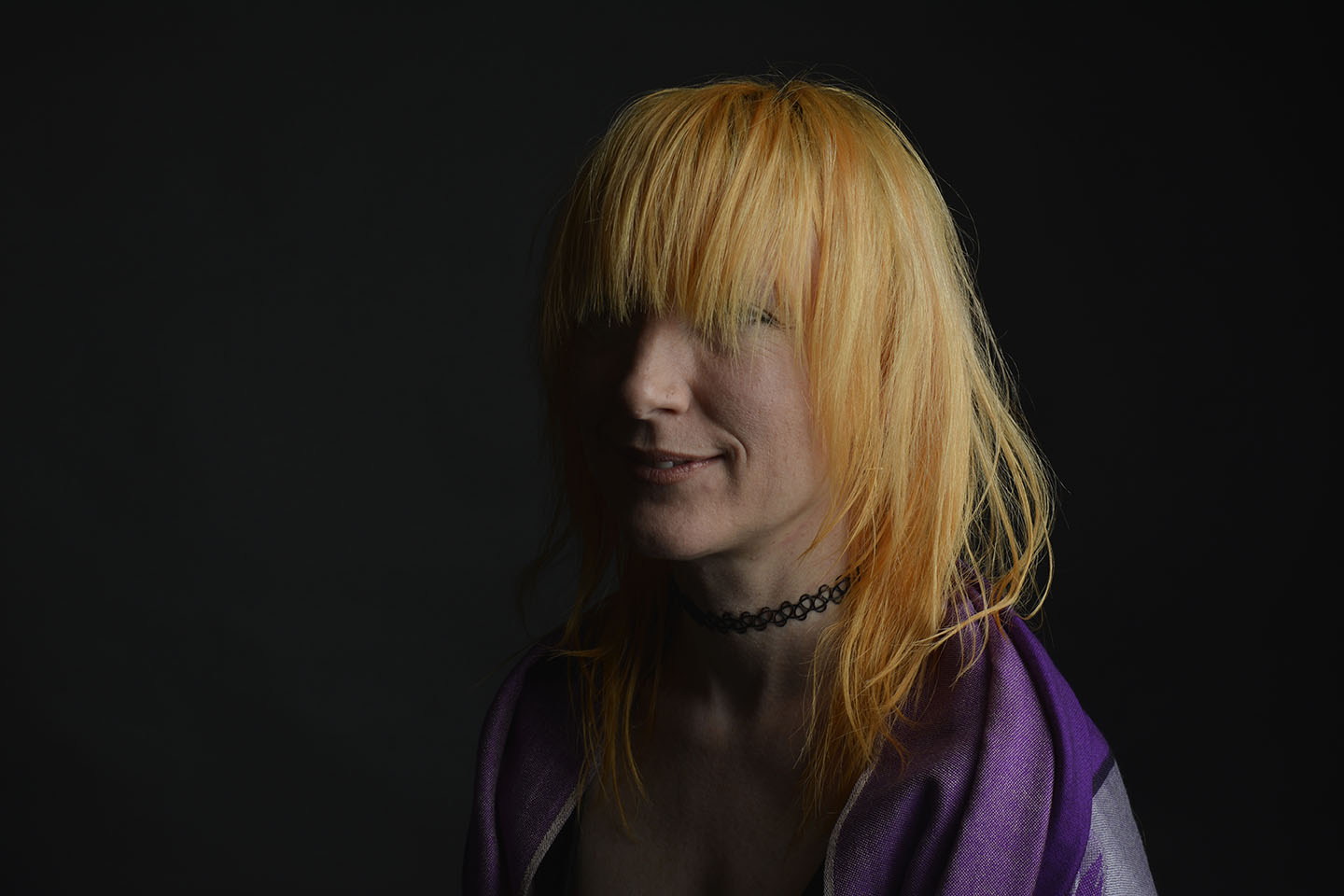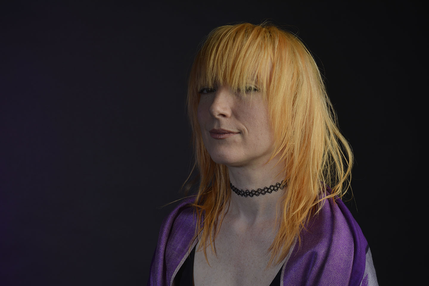 Colour gels/filters were used in these next set of photographs. To complement the models purple shawl and slightly orange hair, purple and orange cellophane have been taped across separate lights. The set up photograph above shows the colours on the lights.