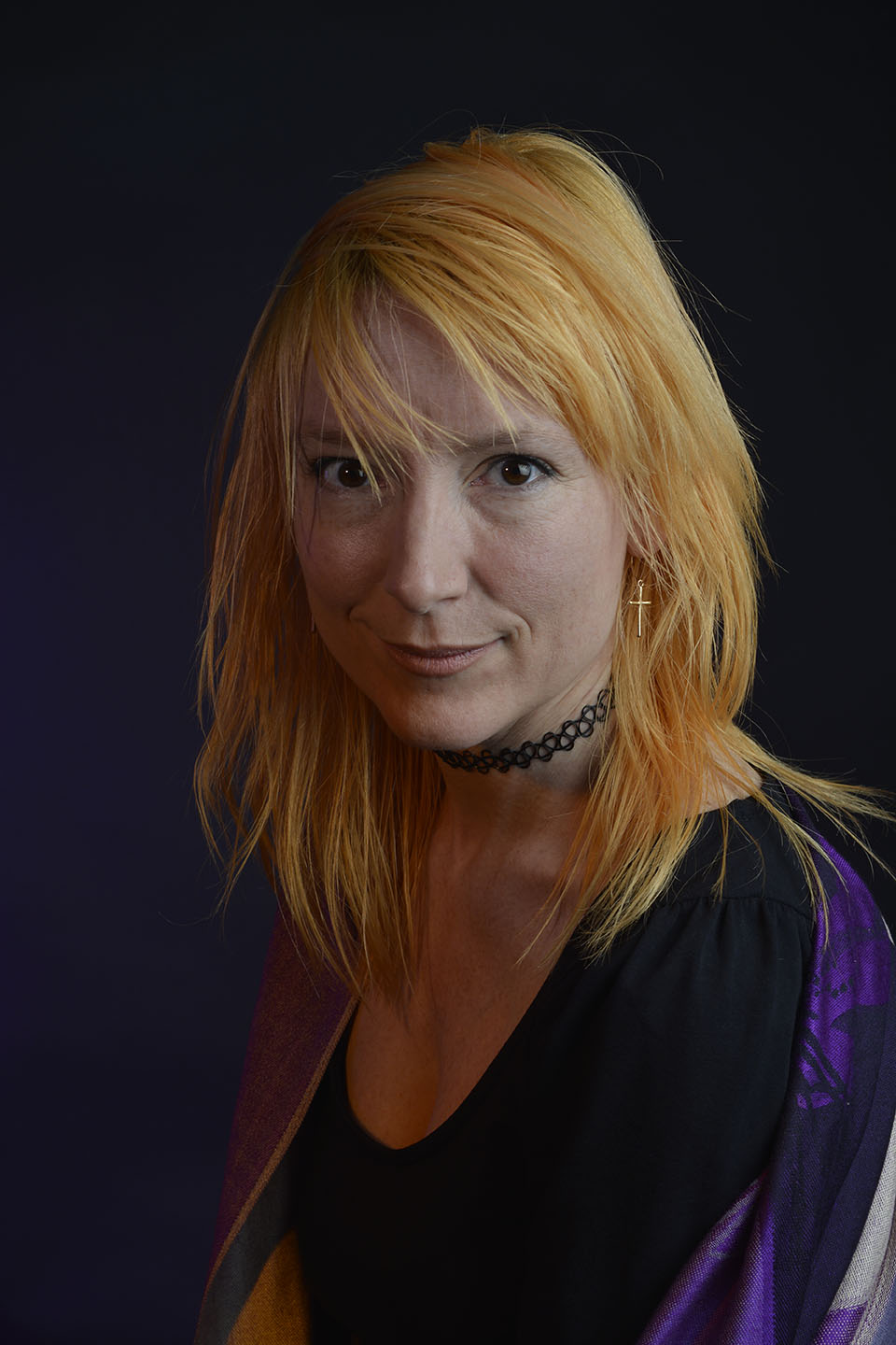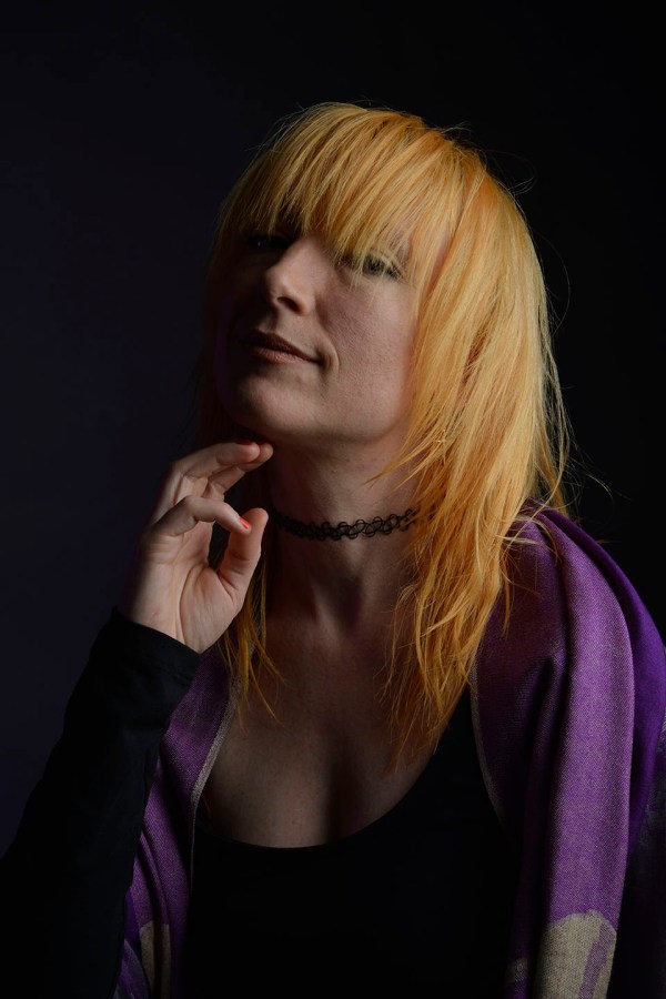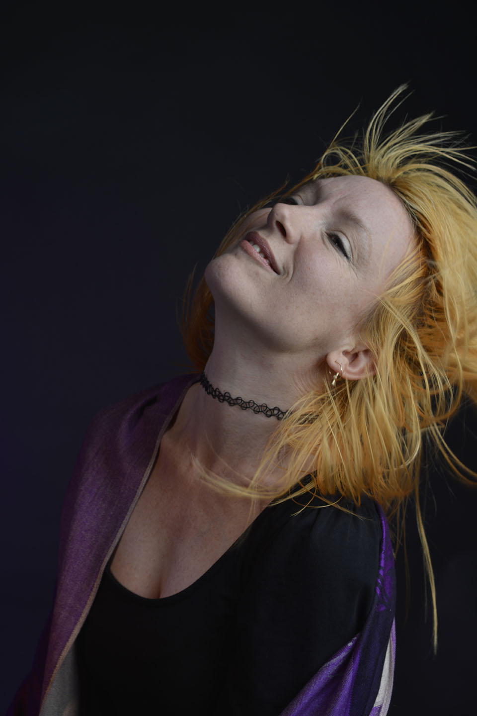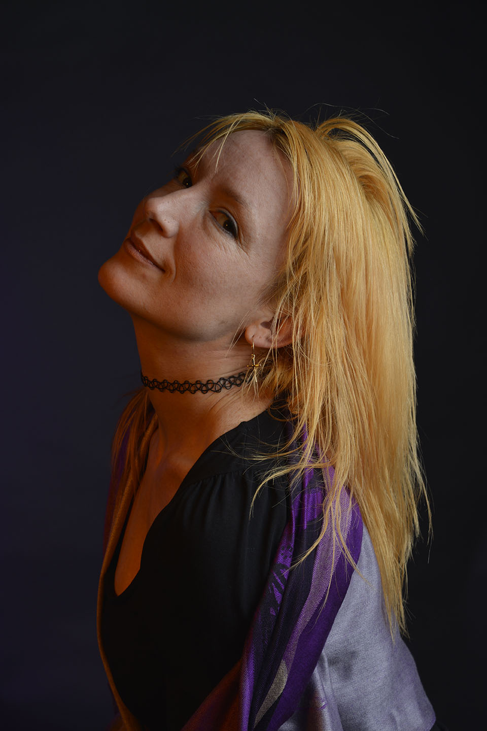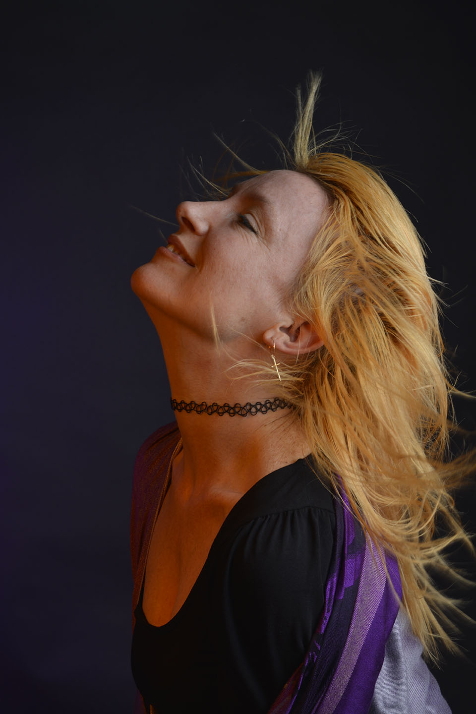 Colour gels/filters were used in these next set of photographs. To complement the models purple shawl and slightly orange hair, purple and orange cellophane have been taped across separate lights. The set up photograph above shows the colours on the lights.