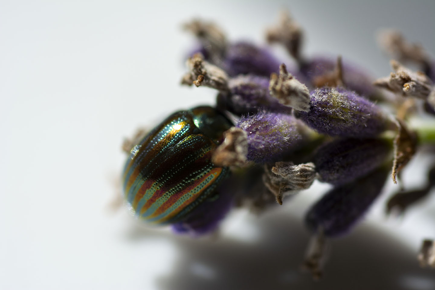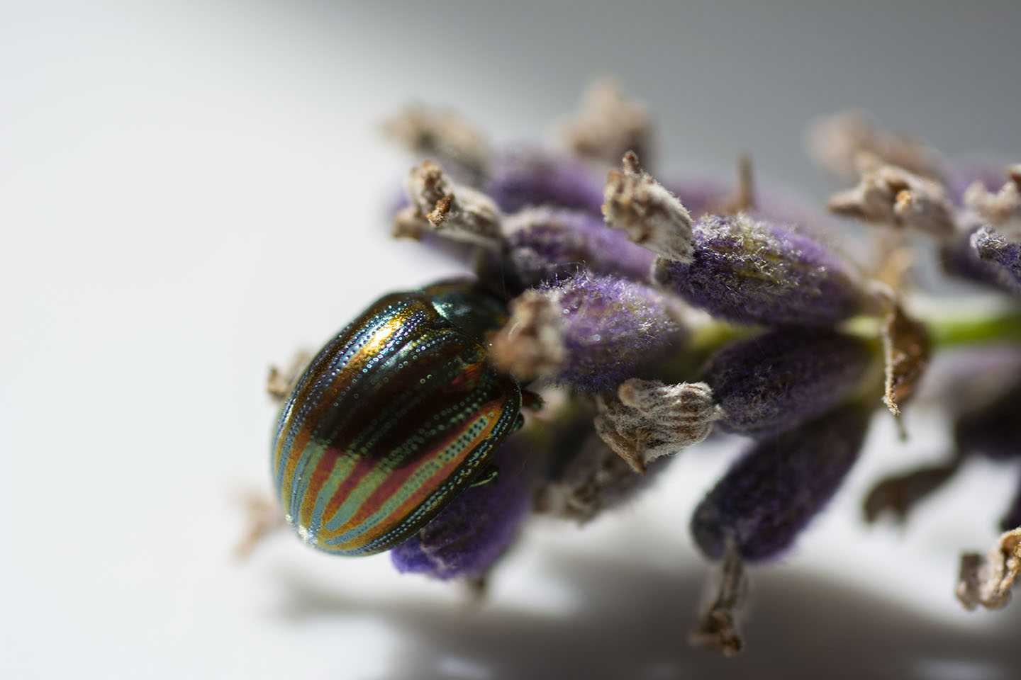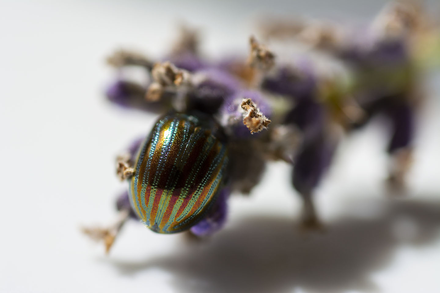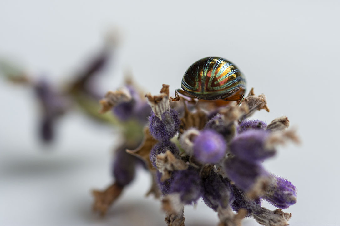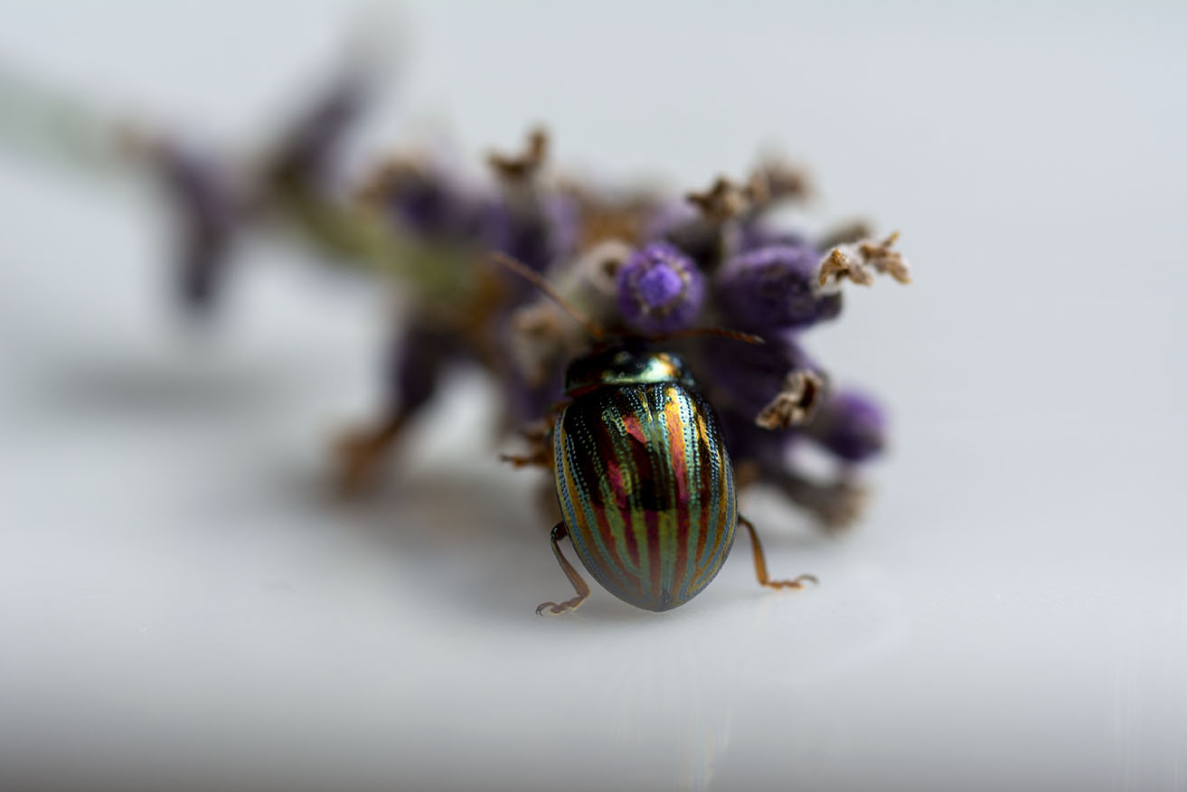 I really loved the colours of the Rosemary Beetle on the Lavender, so I cut a piece with a beelte on and placed it on a plate to try and get a better shot. I had to coax the beetle off the plant as they seem to love being face down in the Lavender.
