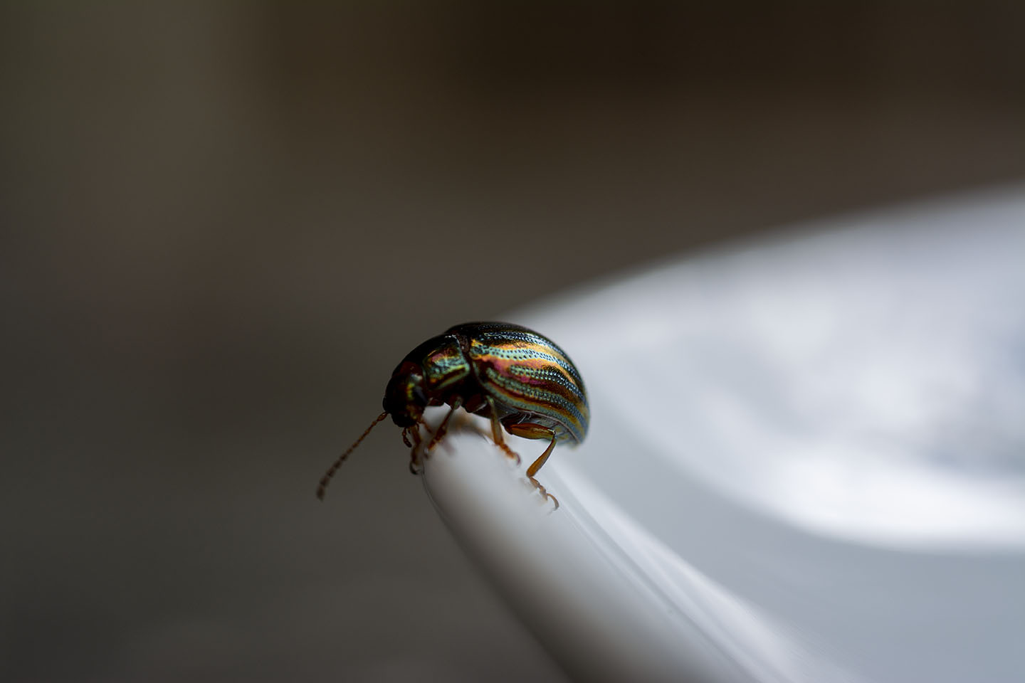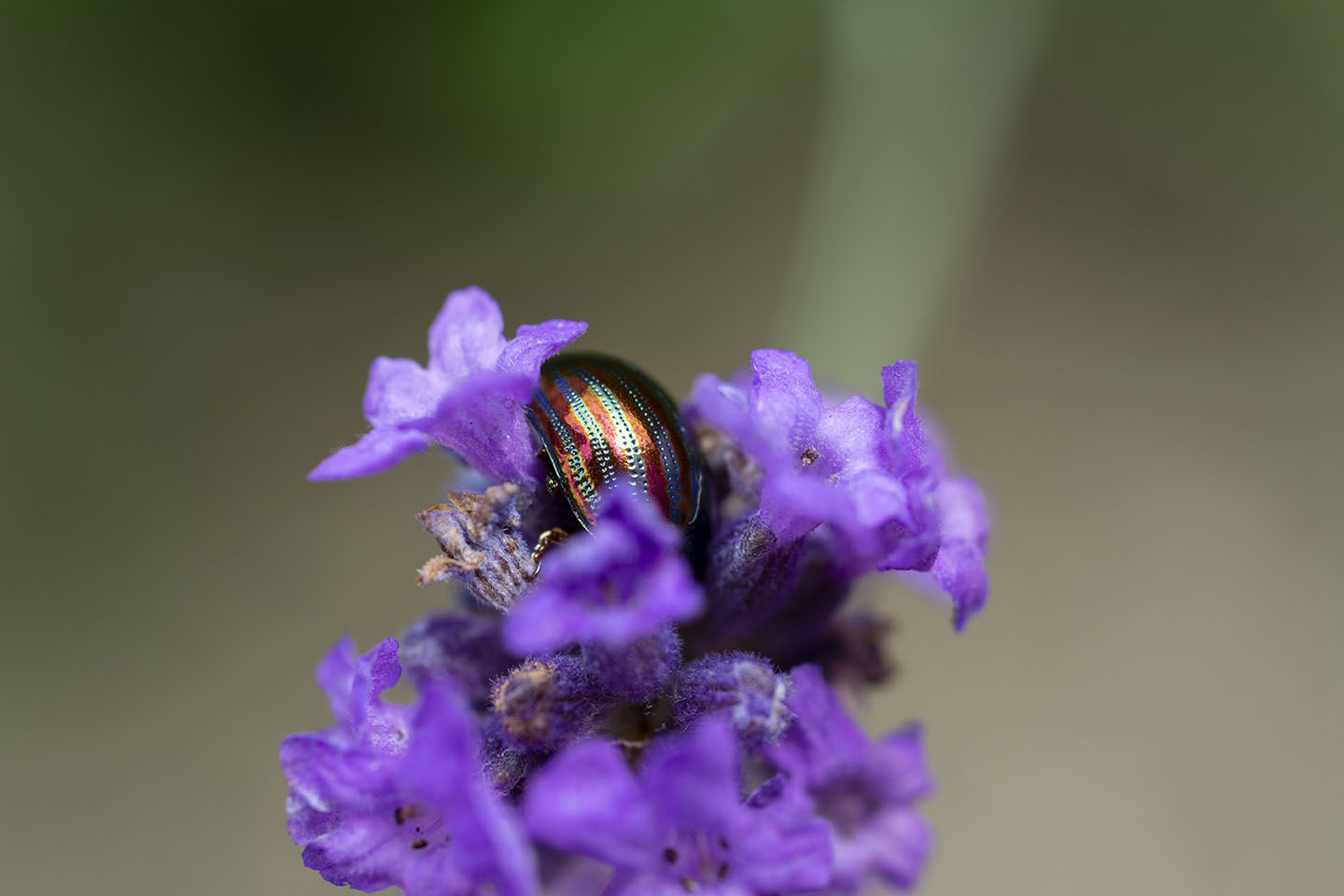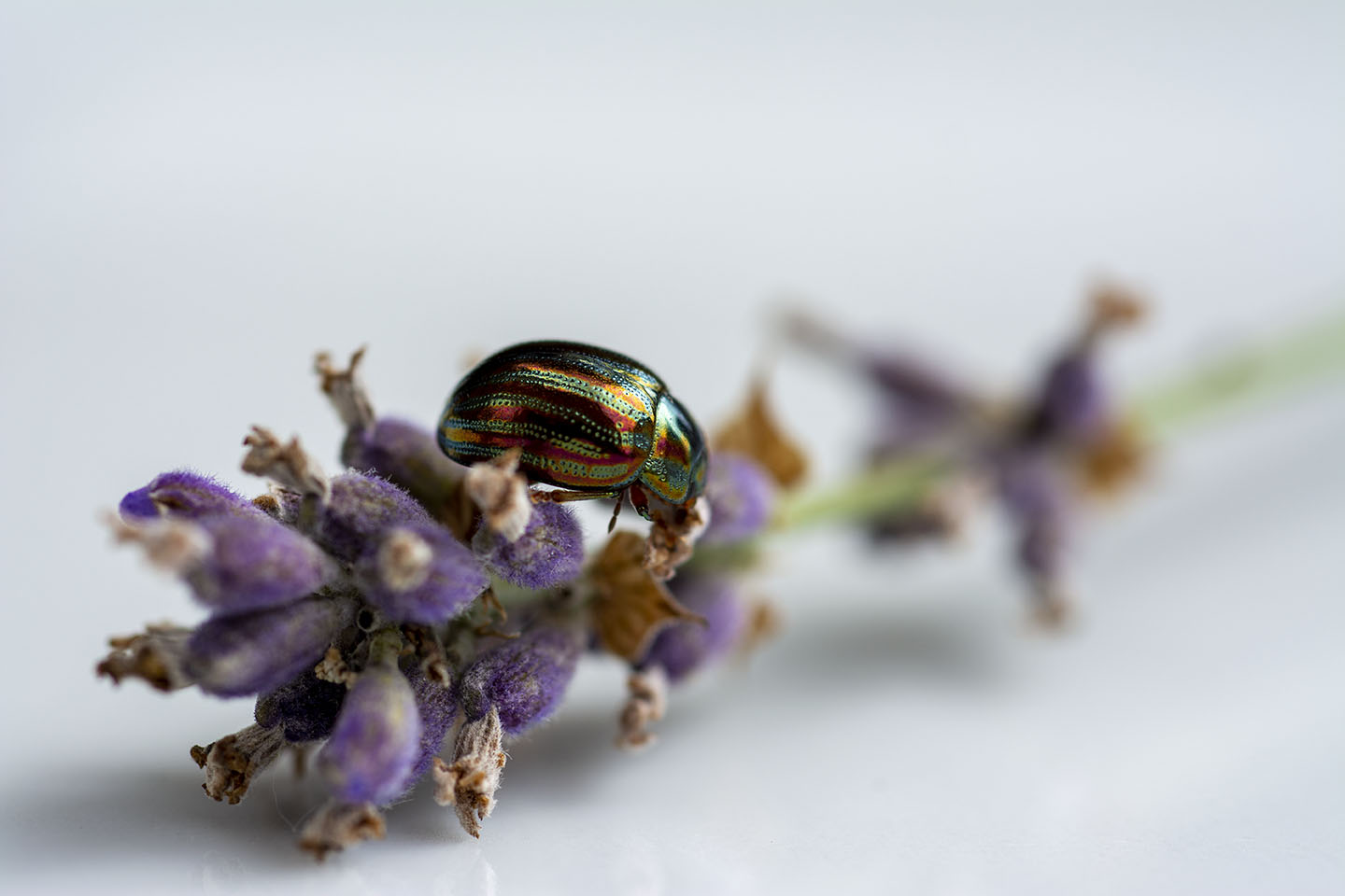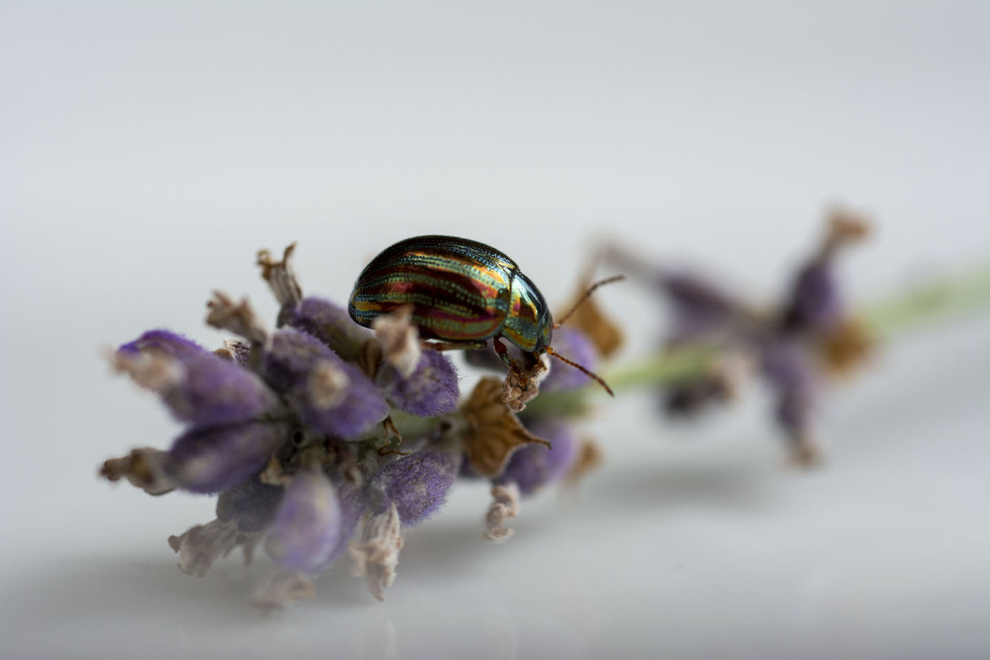 I really loved the colours of the Rosemary Beetle on the Lavender, so I cut a piece with a beelte on and placed it on a plate to try and get a better shot. I had to coax the beetle off the plant as they seem to love being face down in the Lavender.