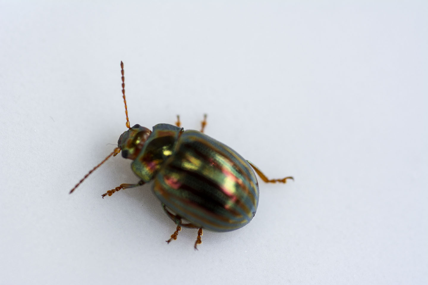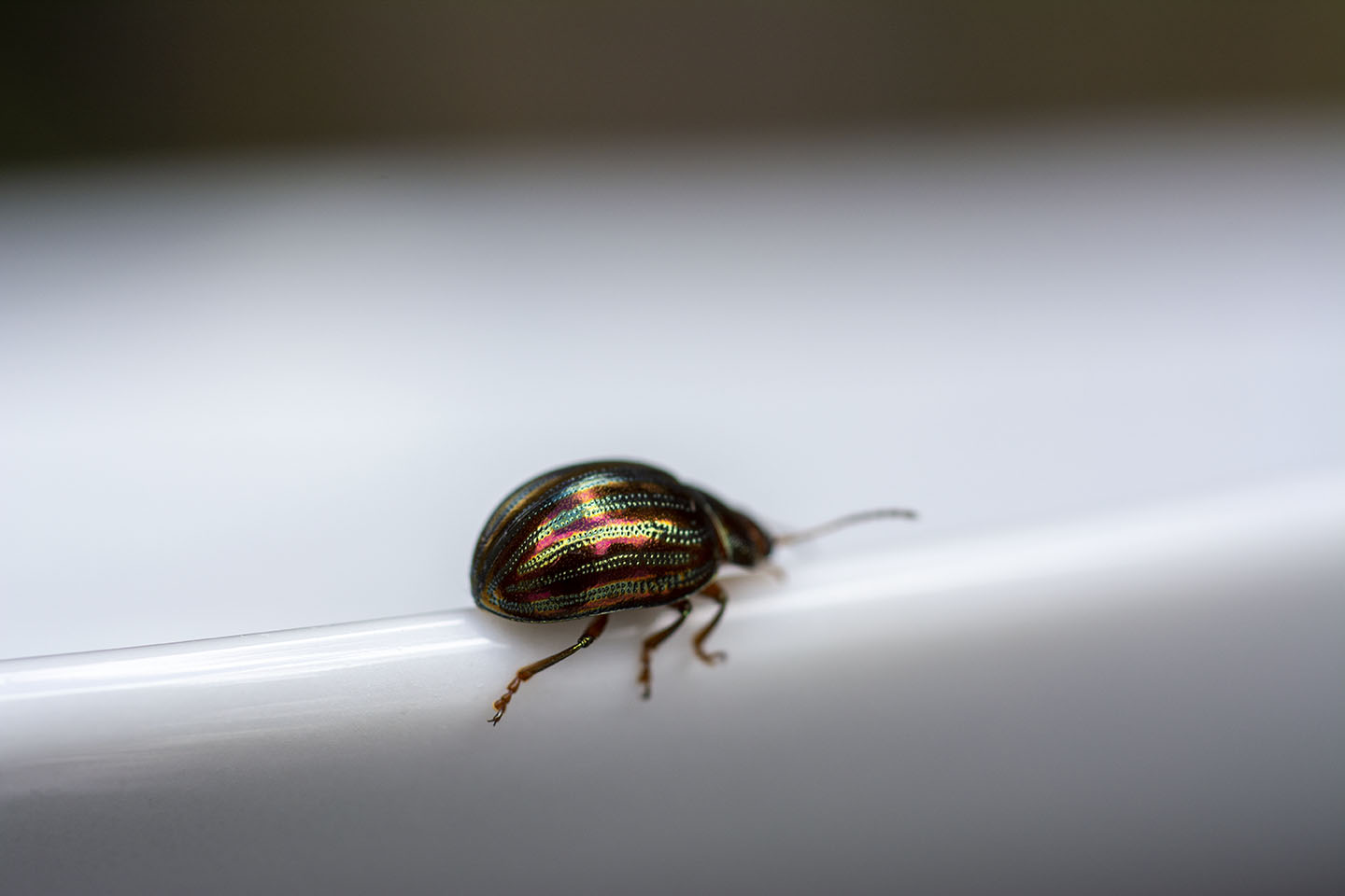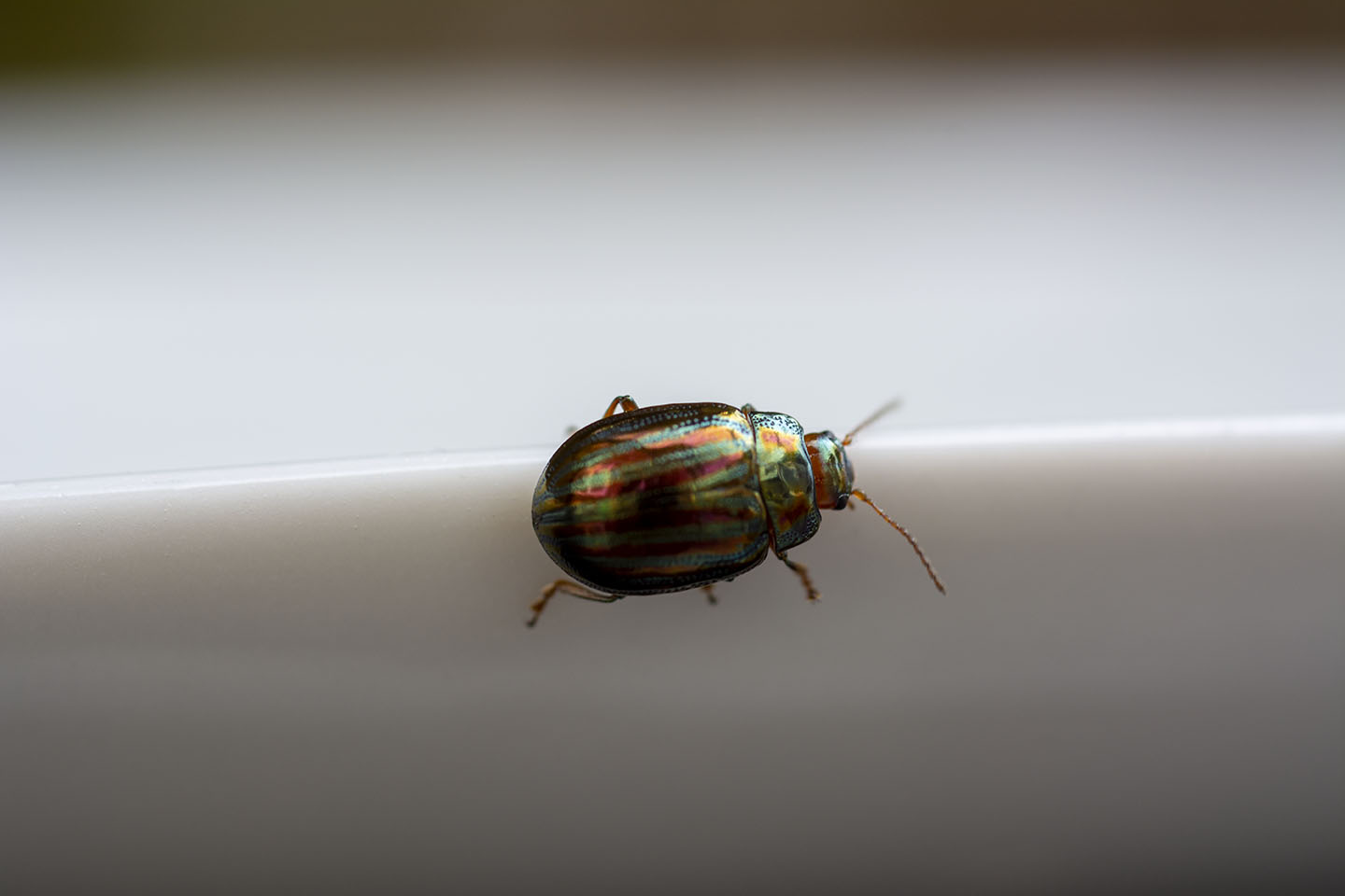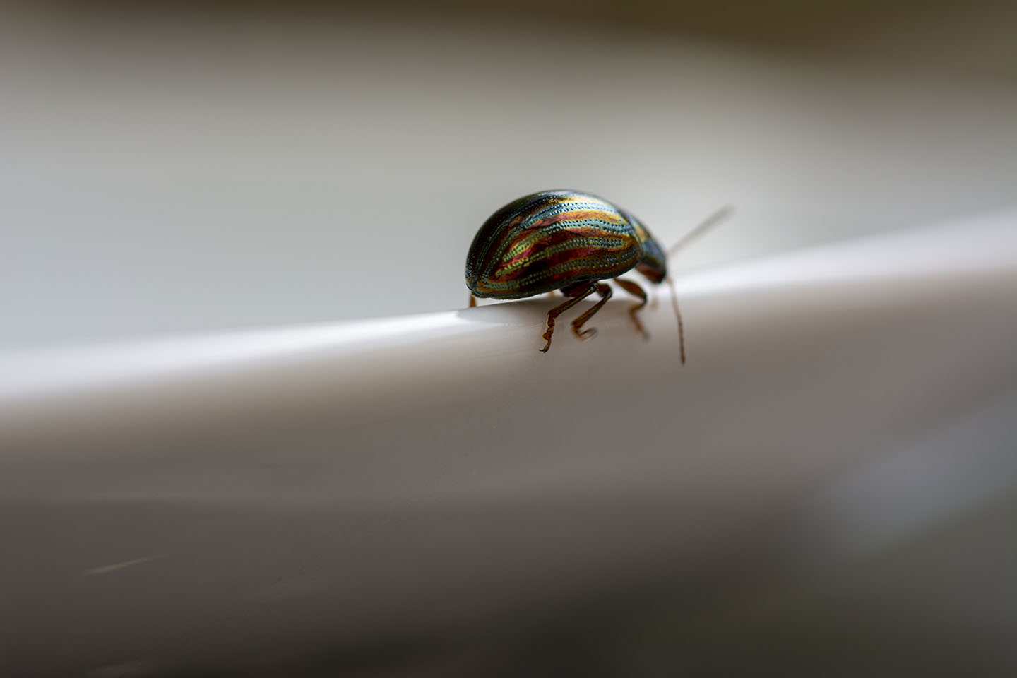 I really loved the colours of the Rosemary Beetle on the Lavender, so I cut a piece with a beelte on and placed it on a plate to try and get a better shot. I had to coax the beetle off the plant as they seem to love being face down in the Lavender.