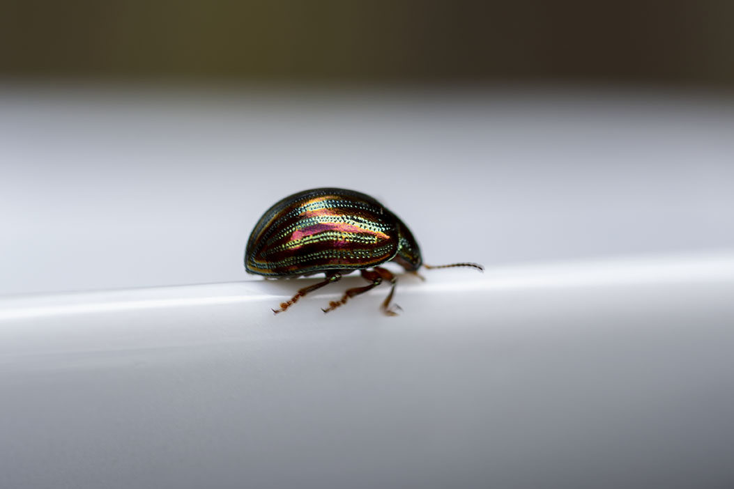With Macro photography the depth of field is very shallow, so to be able to photograph this beetle fully I need to do some Focus Stacking. This is where many shots are taken of a subject but each time the focal point is changed. Then all of the images are stacked together in Photo shop. This will allow a larger area of the photograph to be in focus.