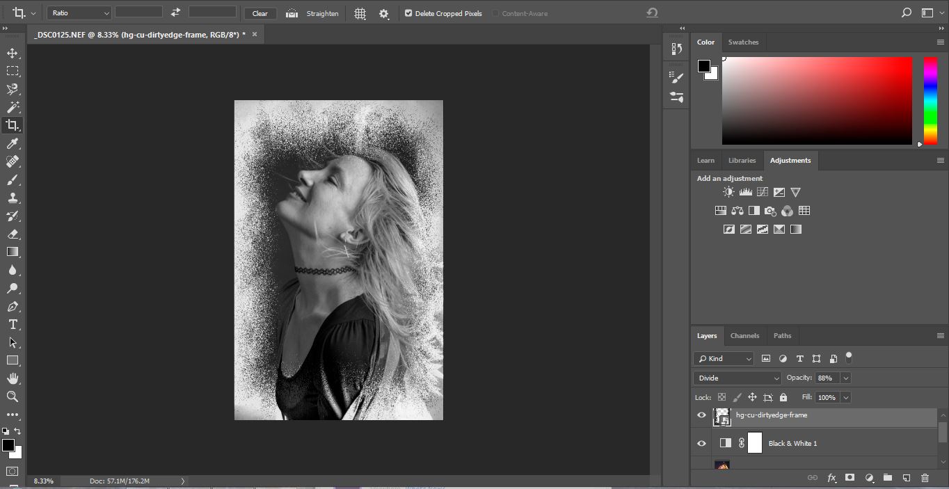 The original frame is black. When I placed it over the portrait image I scrolled through the blending modes. This tool gives slight changes in density, tone and colour to the overplayed image allowing you to create your desired design. I felt with this image, choosing the Divided blending mode with 88% opacity it converted the frame to more negative colours and complimented my portrait.