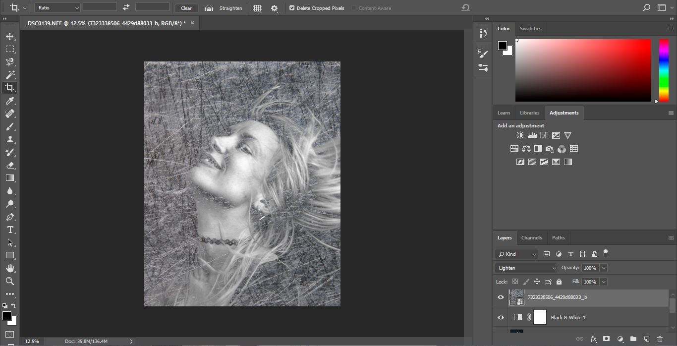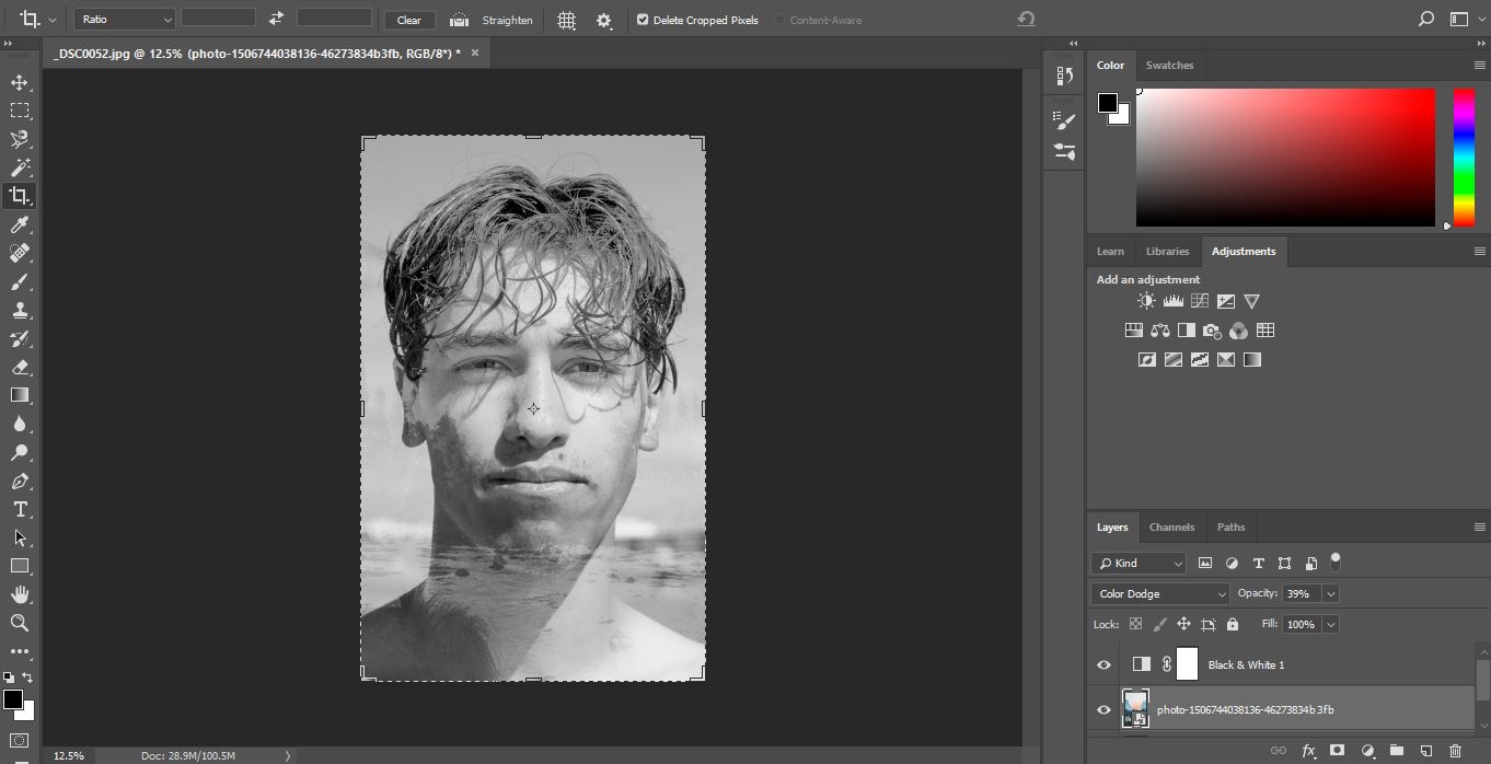 As my portrait image had background in it, I cropped the image to focus on the face. Changed the images into Black and White, then overlay and re-position. Colour Dodge blening mode with 39% opacity was used.